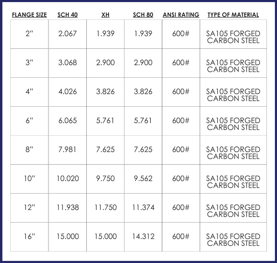 Standard bore sizes are Sch 40, Sch 80 and XH; more are available upon request. Alternate materials and/or sizes available per customer request. |